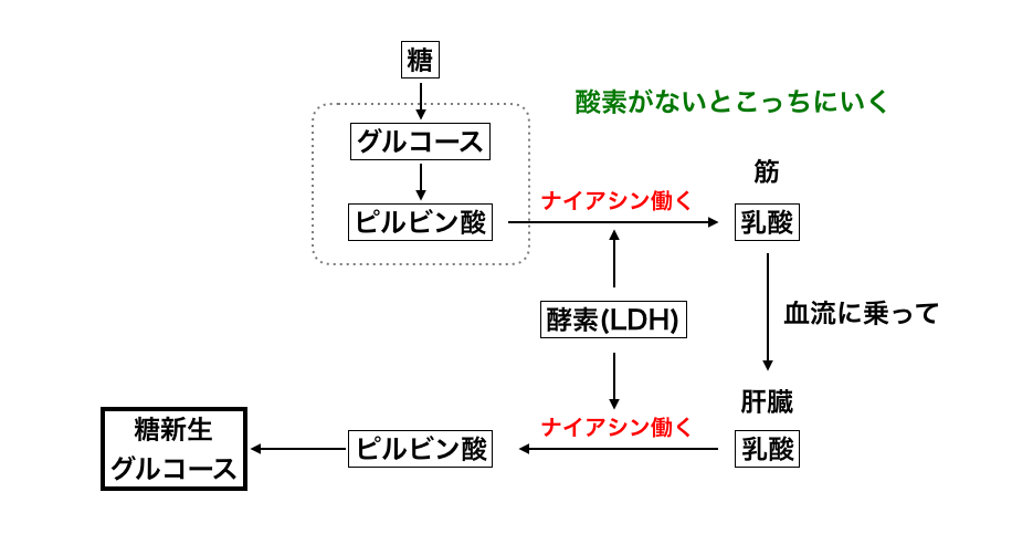 そのストックされている乳酸を再び糖として使えるようにするにはナイアシン(ビタミンB3)が必要。