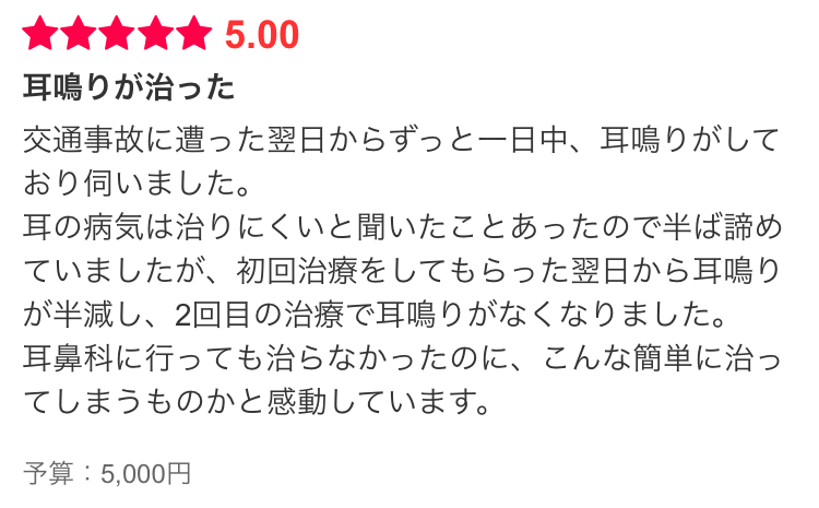 耳の病気は治りにくいと聞いたことあったので半ば諦めていましたが、初回治療をしてもらった翌日から耳鳴りが半減し、2回目の治療で耳鳴りがなくなりました。