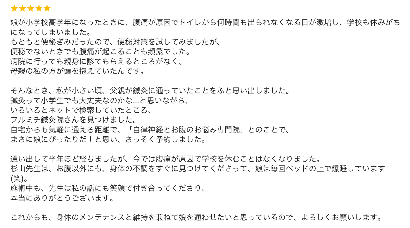 通い出して半年ほど経ちましたが、今では腹痛が原因で学校を休むことはなくなりました。